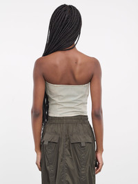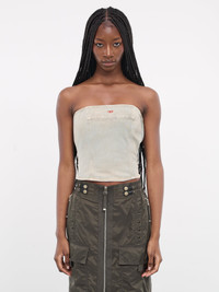 DIESEL top in beige, bandeau tube top design, paneled denim construction, straight neckline, strapless, front logo embroidery, side concealed zip closure, straight hem, slim fit. 100% Cotton Standard Sizing Model is 5'10" wearing size XS. Bust: 30" Waist: 24" Hips: 34.5"