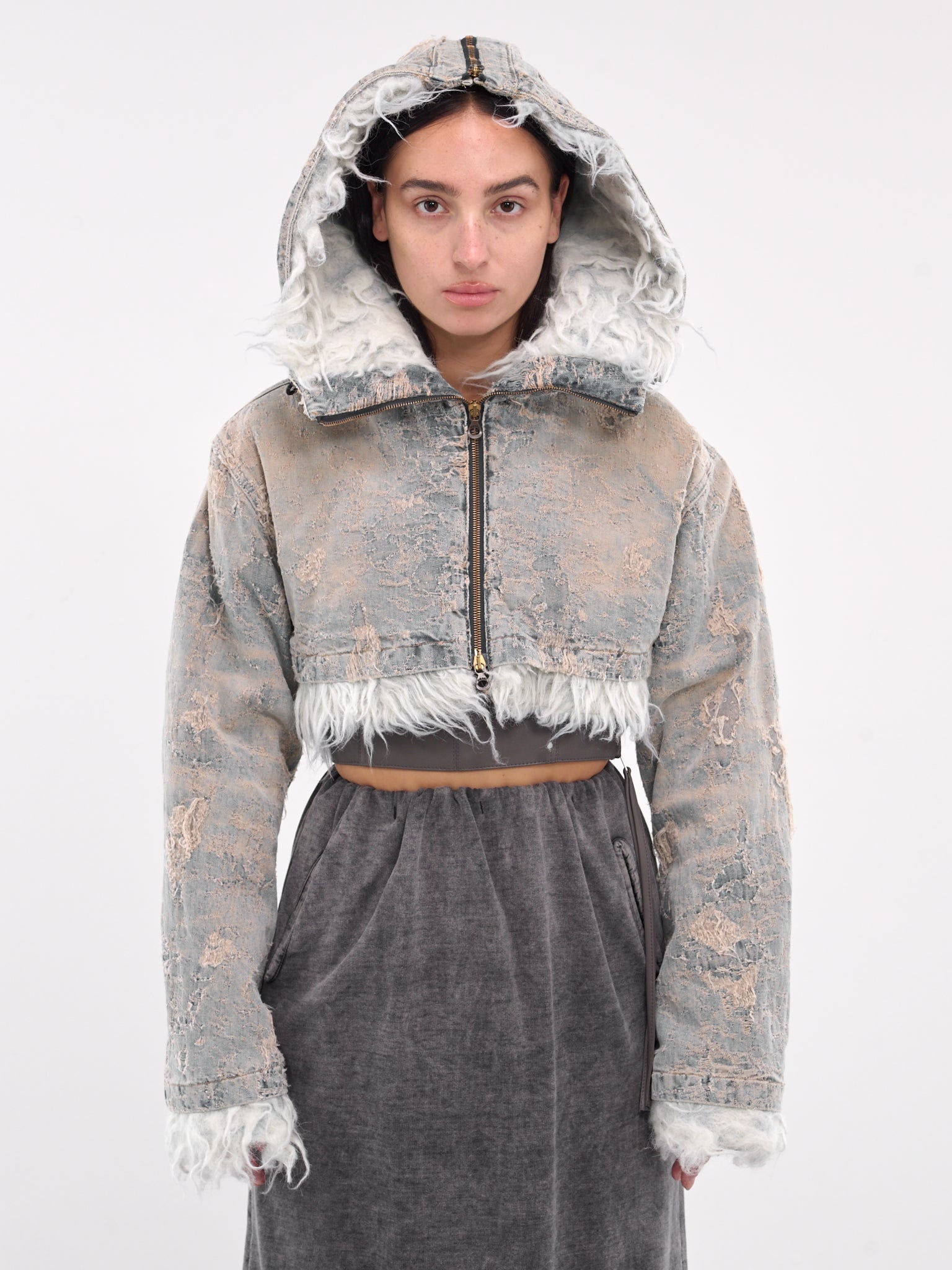 DIESEL jacket in blue, paneled construction, devore denim trompe l'oeil print, full-zip hood, front exposed two-way zip closure, long sleeves, straight hem, cropped length, shearling lining, relaxed fit. European Sizing Model is 5'6" wearing size 38. Bust: 31" Waist: 24" Hips: 34"