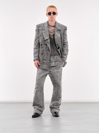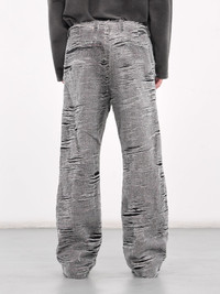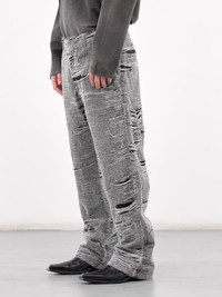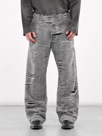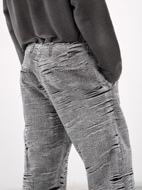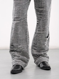 DIESEL pants in grey, paneled construction, plaid pattern, distressing & loose thread, belt loops, front concealed zip fly closure, back welt pocket, wide leg, relaxed fit. Standard Sizing Model is 6'0" wearing size 32. Shoulders: 18" Chest: 36" Waist: 28"