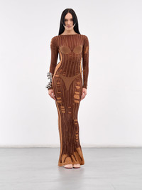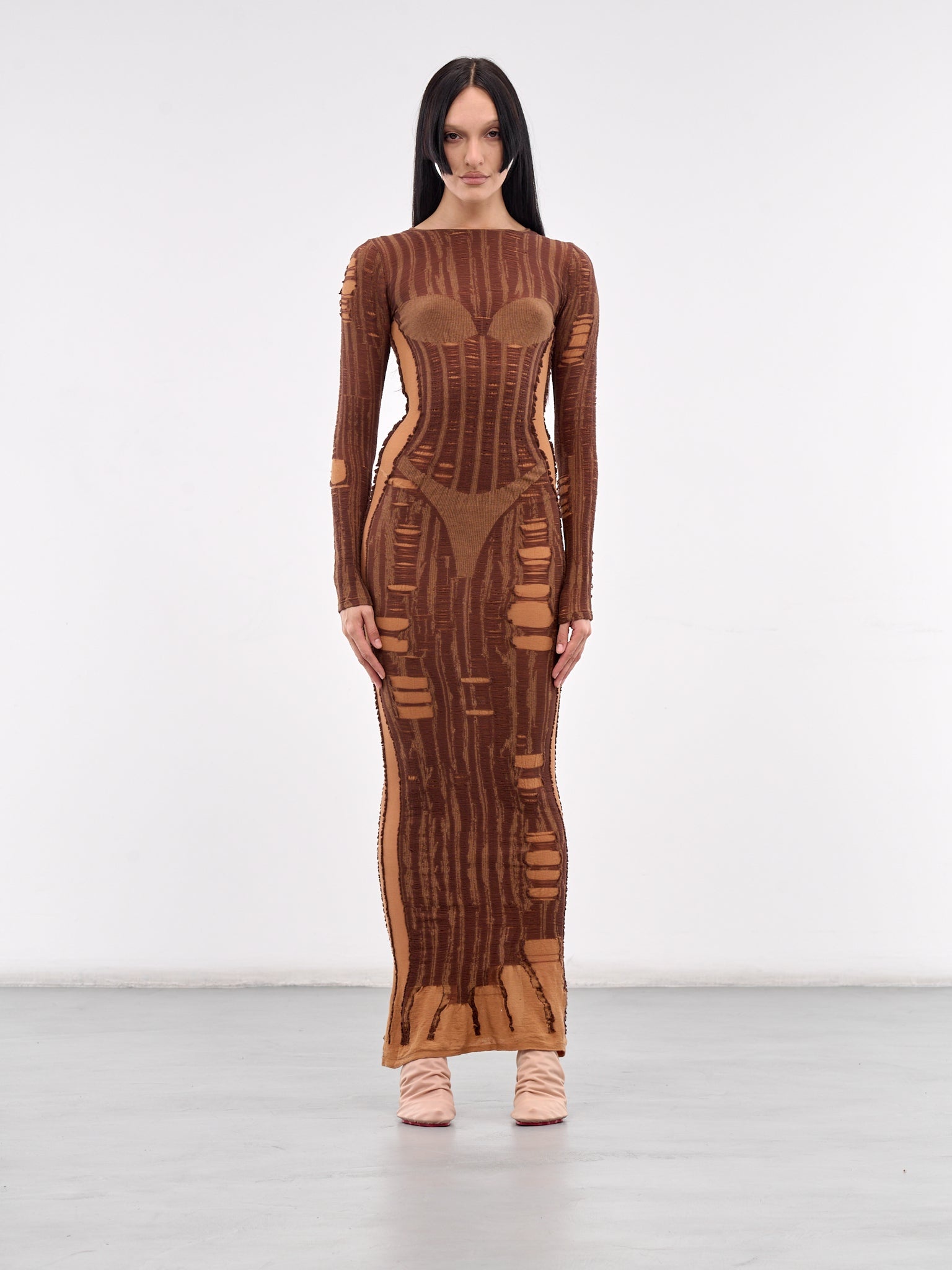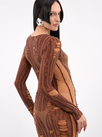 DIESEL dress in wood, paneled knit construction, all-over distressing, trompe l'oeil bra & thong, wide neck, long sleeves, straight hem, maxi-length, slim fit. Standard Sizing Model is 5'8" wearing size S. Bust: 32" Waist: 26" Hips: 34.5"