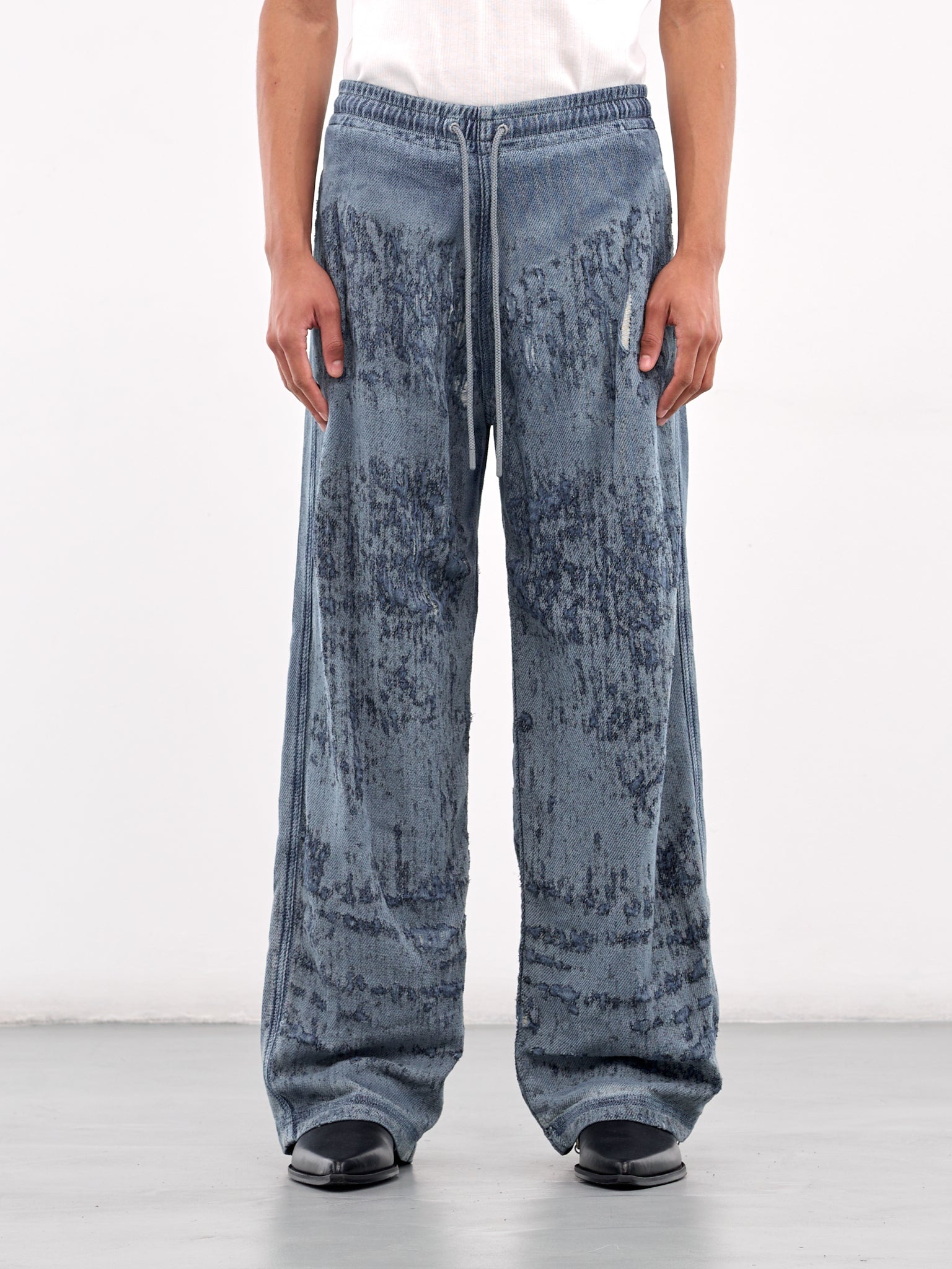 DIESEL jeans in blue, paneled denim construction, heavy distressing, elasticated waistband, adjustable drawstring, side pockets, back patch pocket, wide leg, relaxed fit. Standard Sizing Model is 6'1" wearing size M. Shoulders: 19" Chest: 38" Waist: 28"