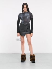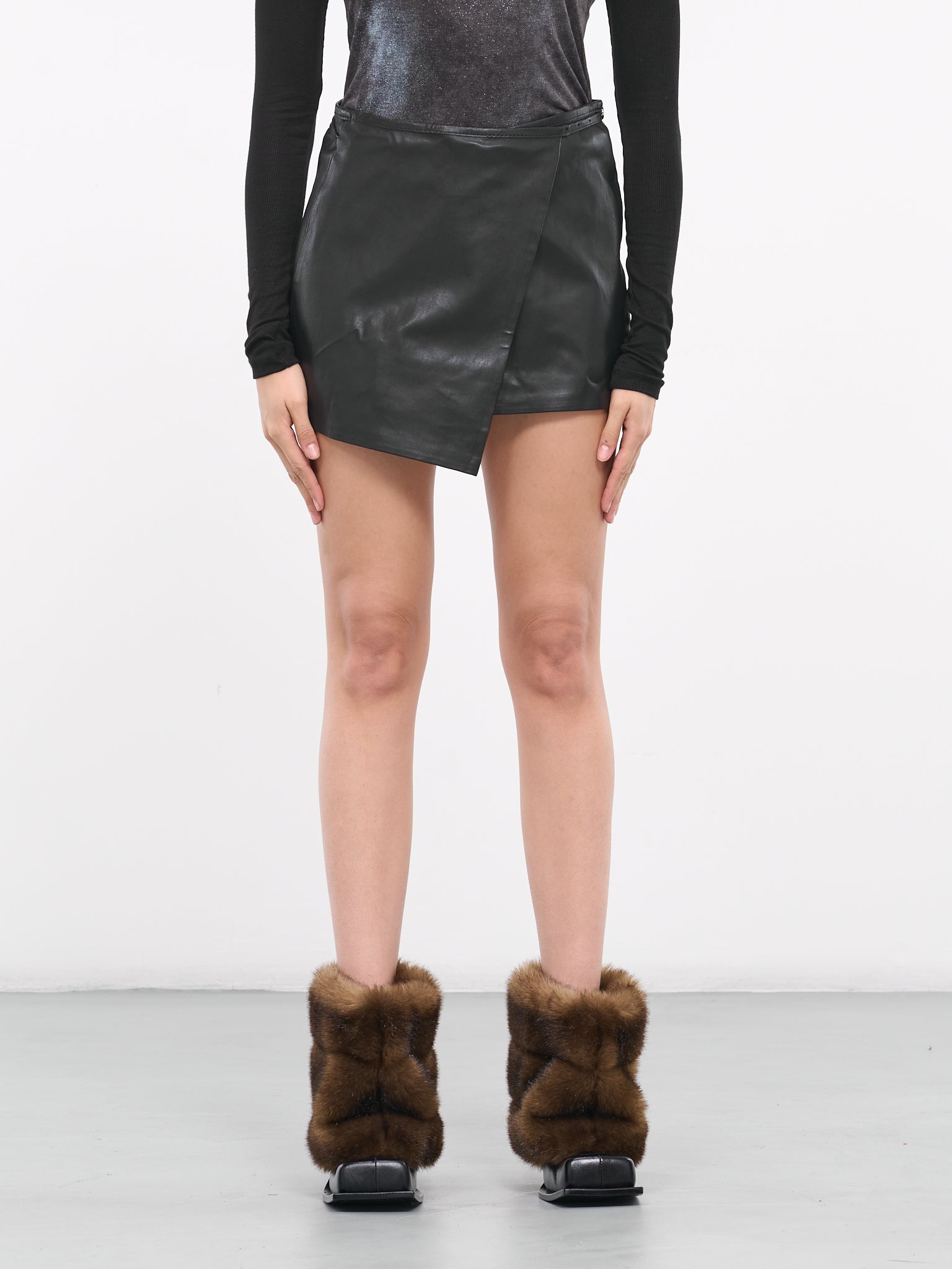 DIESEL skirt in black, wrap-style design, paneled sheepskin construction, mid-rise, adjustable belt fastening, signature logo buckle, asymmetric hem, lined, mini-length, slim fit. Outer: 100% Sheepskin Leather Inner: 96% Cotton 4% Elastane Italian Sizing Model is 5'8" wearing size 38. Bust: 32" Waist: 26" Hips: 34.5"