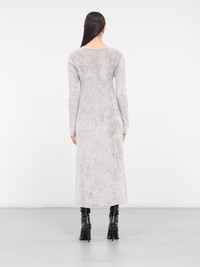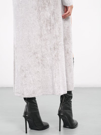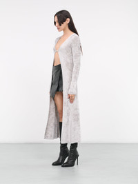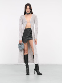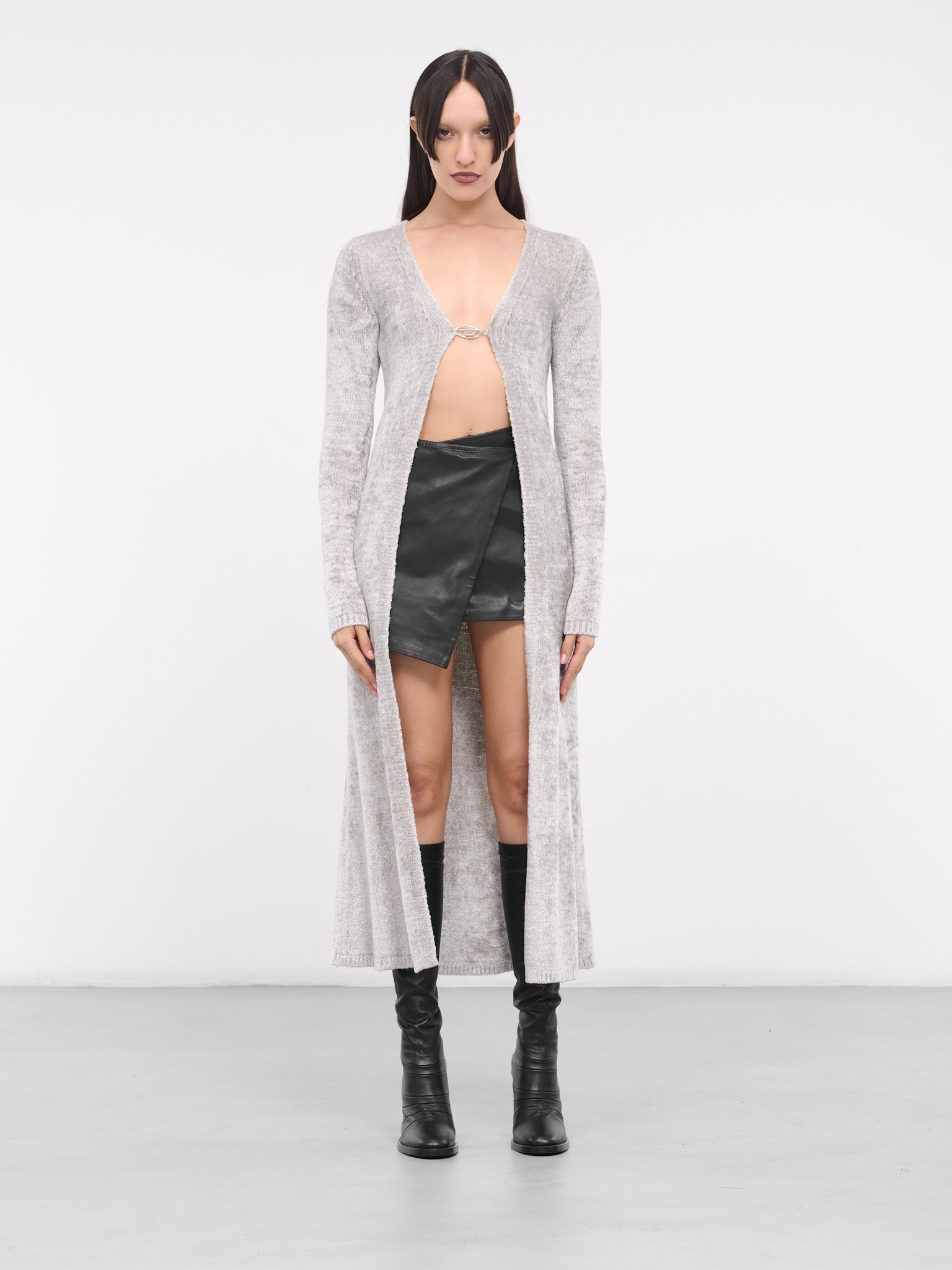 DIESEL cardigan in grey, fuzzy viscose chenille construction, v-neckline, front logo plaque fastening, open front, long sleeves, ribbed cuffs & hem, straight hemline, maxi-length, slim fit. 72% Viscose 28% Polyamide Standard Sizing Model is 5'8" wearing size S. Bust: 32" Waist: 26" Hips: 34.5"