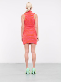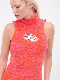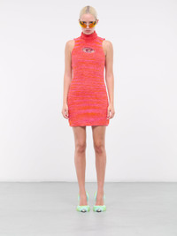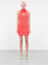DIESEL pink & orange dress, recycled cotton-nylon construction, fluffy texture, high neck, sleeveless, signature logo plaque cut-out, mini length, regular fit. 43% Polyester 42% Cotton 14% Polyamide 1% Elastane Standard Sizing Model is 5'9" wearing size XS. Bust: 32" Waist: 24" Hips: 34"