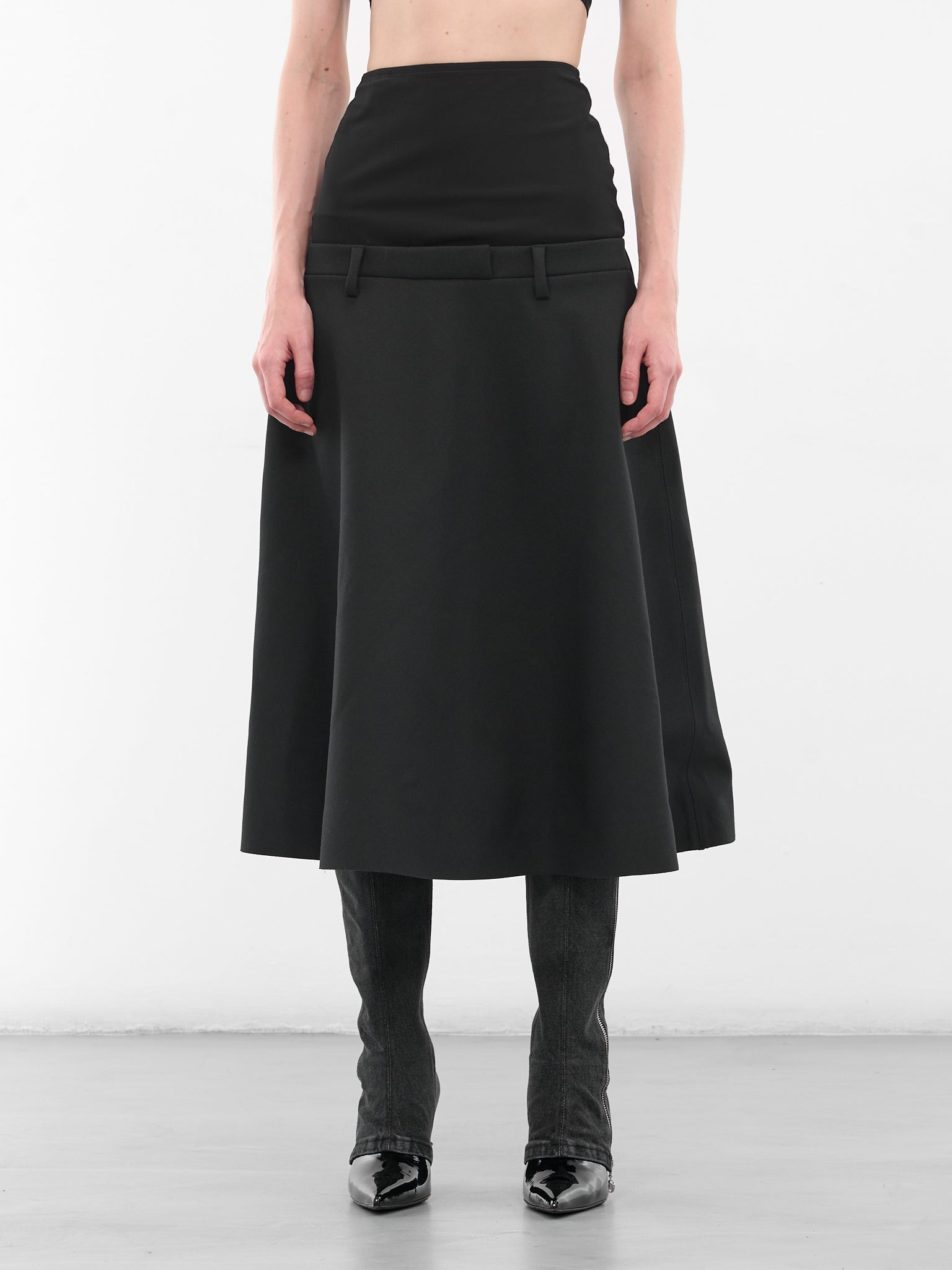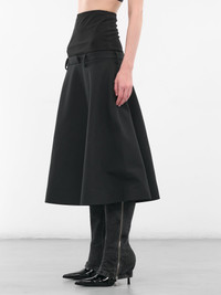 O-Grace-Bond midi skirt in bonded neoprene with an A-line cut, exaggerated low waist and a thigh-hugging insert for structure. Featuring: • Slim fit • A-line silhouette • Low-cut waist • Neoprene bonded construction • Thigh-hugging insert • Outer: 66% Polyester 28% Viscose 6% Elastane | Inner: 100% Polyester | Contrast: 74% Polyamide 26% Elastane • Italian sizing Model is 5'9" wearing size 38. Bust: 32" Waist: 25" Hips: 34"