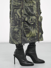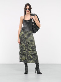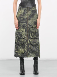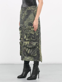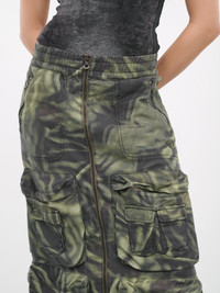 DIESEL skirt in green & black, technical utilitarian design, paneled Tencel lyocell twill construction, zebra-inspired camouflage print, low-rise, elasticated waistband, front exposed two-way zip closure, inset zip pockets, front cargo pockets, side zip vents, hem adjustable bungee drawcord, straight hem, maxi-length, relaxed fit. 100% Lyocell Italian Sizing Model is 5'8" wearing size 38. Bust: 32" Waist: 26" Hips: 34.5"