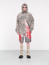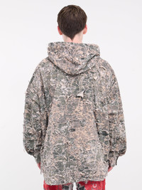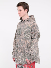 DIESEL jacket in military green, paneled cotton construction, camouflage print, distressing throughout, hooded & adjustable bungee drawcords, front buttoned placket closure, long sleeves, single-button barrel cuffs, chest patch pockets, shirttail hem, nylon lined, oversized fit. Outer: 100% Cotton Inner: 100% Polyamide European Sizing Model is 6’0” wearing size 48. Shoulders: 19" Chest: 38” Waist: 30”