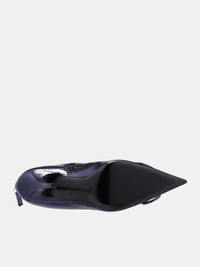 DIESEL boots in indigo, paneled leather construction, embossed pattern, iridescent finish, low-top, back zip closure, stiletto heel, metal logo plaque, pointed toe, rubber-injected sole. European Sizing