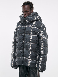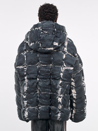 DIESEL jacket in grey, paneled poly construction, padded & quilted, overprinted camouflage pattern, high neck, hood, front exposed zip closure, long sleeves, elasticated cuffs, straight hem, oversized fit. 100% Polyester European Sizing Model is 5'11.5" wearing size 50. Shoulders: 16" Chest: 32.5" Waist: 30"