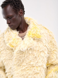 DIESEL jacket in yellow, alpaca-poly blend, paneled knit construction, shaggy texture, notched lapel, front double-breasted button closure, long sleeves, straight hem, regular fit. 80% Alpaca 20% Polyester Standard Sizing Model is 5'11.5" wearing size M. Shoulders: 16" Chest: 32.5" Waist: 30"