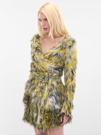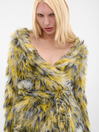 M-Annaine cardigan in black and yellow fuzzy knit with a relaxed wrap silhouette, belted closure and asymmetric hem. Featuring: • Relaxed fit • Knit construction with long-pile fuzzy texture • V-neckline • Long sleeves • Wrap-over belted closure • Asymmetric hem • Main: 86% Polyamide 8% Acrylic 6% Mohair • Standard sizing Model is 5'9" wearing size S. Bust: 32" Waist: 25" Hips: 34"
