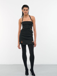 DION LEE dress in black, bodice design, organic cotton stretch twill, interlocking panels, cut-out details, straight neckline, adjustable halter strap, signature safety slider, front slits, back exposed metal zip closure, mini length, fitted. UK Sizing Body - 98% Cotton, 2% Elastane Lining - 100% Cupro Model is 5'10" wearing size 6. Bust: 32" Waist: 24" Hips: 35"