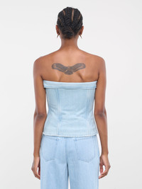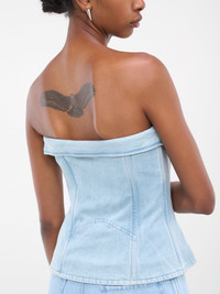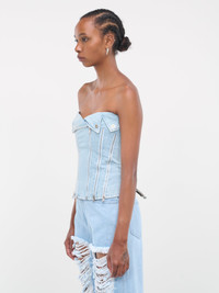 DION LEE top in blue, biker strapless bodice design, rigid cotton denim, lapel neckline, exposed metal zip boning, brushed silver hardware, adjustable fit, fitted. 100% Cotton UK Sizing Model is 5'10" wearing size 8. Bust: 32" Waist: 27" Hips: 34"