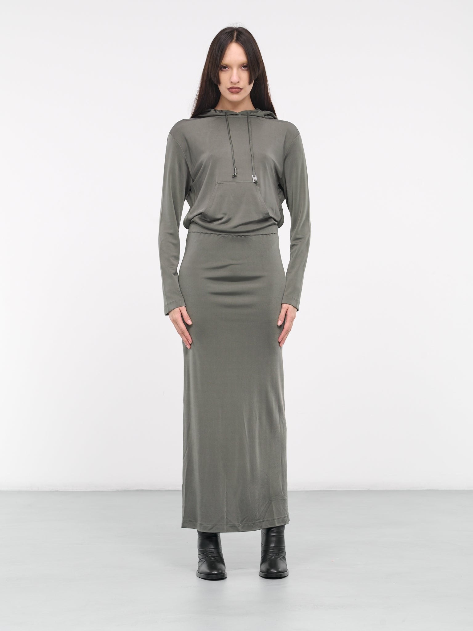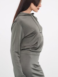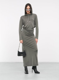 DION LEE dress in green, hoodie dress design, paneled viscose jersey construction, hooded, adjustable drawstrings, silver-tone hardware, open back, dropped shoulders, long sleeves, kangaroo pocket, back vent, straight hem, maxi-length, slim fit. 100% Viscose UK Sizing Model is 5'8" wearing size 8. Bust: 32" Waist: 26" Hips: 34.5"