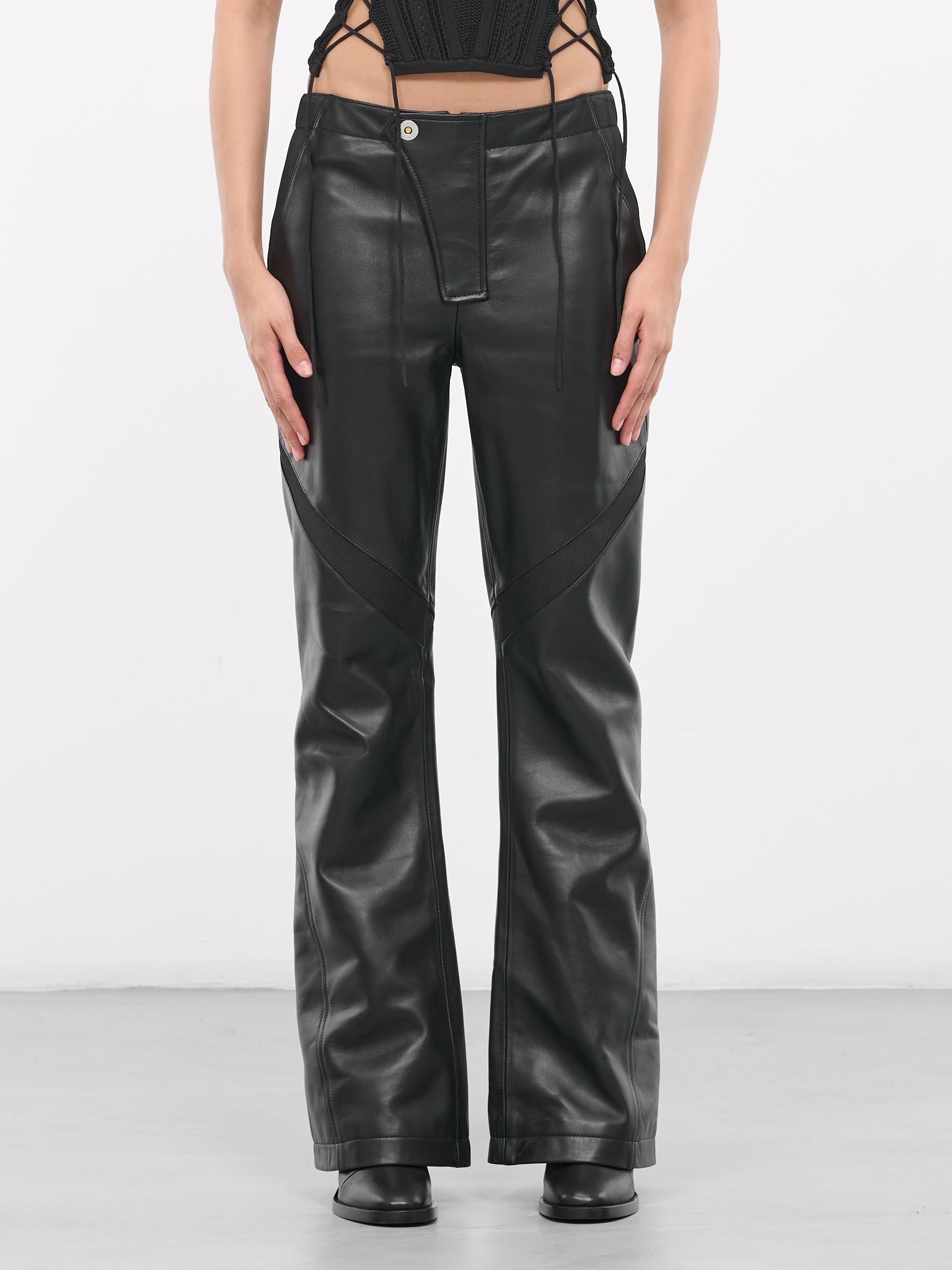 DION LEE black trousers, paneled nappa leather construction, low-rise, signature eyelet snap, fly tab closure, side seam pockets, ribbed jersey contrast panels, back exposed zip vents, fully lined, subtle flared leg, slim fit. Imported Outer: 100% Lambskin Inner: 51% Cupro 49% Cotton Contrast: 100% Viscose Standard Sizing Model is 5'8" wearing size S. Bust: 32" Waist: 26" Hips: 34.5"