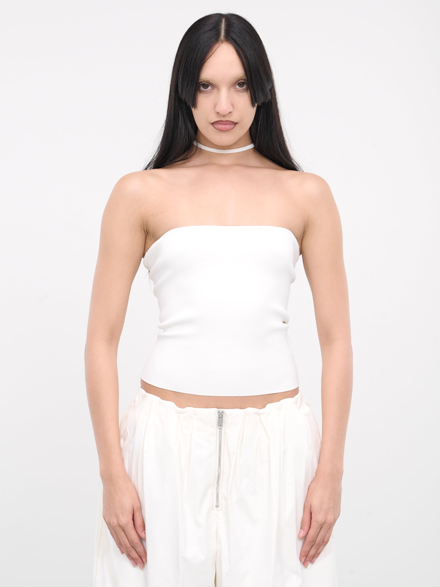 DION LEE top in white, tank top design, viscose-nylon blend, paneled construction, reverse halterneck, straight neckline, sleeveless, straight hem, slim fit. 65% Viscose 34% Nylon 1% Elastane Standard Sizing Model is 5'8" wearing size S. Bust: 32" Waist: 26" Hips: 34.5"