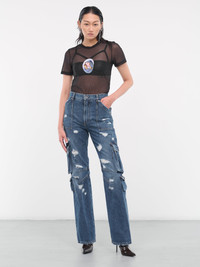 DOLCE & GABBANA blue pants, cargo design, non-stretch denim, distressed details, high-waist, belt loops, button & zip-fly, four pockets, side flap pockets, branded metal plauqe, denim topstitching, straight leg, regular fit. Made in Italy 100% Cotton Italian Sizing Model is 5'10" wearing size 40. Bust: 31" Waist: 23.5" Hips: 35"
