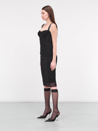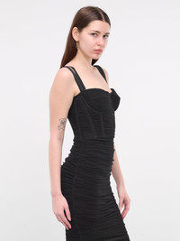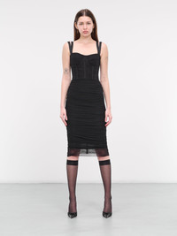 DOLCE & GABBANA dress in black, paneled tulle construction, sweetheart neckline, twin adjustable shoulder straps, sleeveless, armscyes, partially open back, back concealed zip closure, corset-style boned bodice, ruched waist, hem semi-sheer paneling, straight hem, silk slip dress lined, midi-length, slim fit. Made in Italy Outer: 53% Cotton 26% Polyamide 21% Spandex Inner: 46% Silk 26% Cotton 15% Spandex 13% Polyamide Italian Sizing Model is 5'10" wearing size 40. Bust: 33" Waist: 24" Hips: 35"
