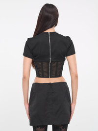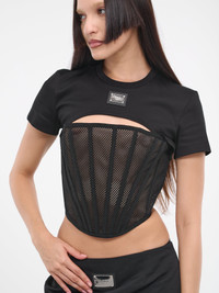 DOLCE & GABBANA black t-shirt, corseted design, cotton & polyester blend, paneled construction, logo plaque, cut-out, boning details, rib knit crewneck, short sleeves, back zip closure, slim fit. Made in Italy Body - 50% Cotton, 50% Polyester Trim - 100% Cotton Italian Sizing Model is 5'8" wearing size 40. Bust: 32" Waist: 26" Hips: 34.5"