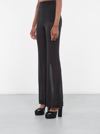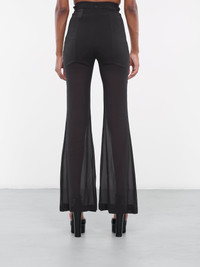 DION LEE pants in black, flared silhouette, semi-sheer, high-waist, back concealed zip closure, full length, semi-fitted. Italian Sizing Model is 5'10" wearing size 40. Bust: 32" Waist: 27" Hips: 34"