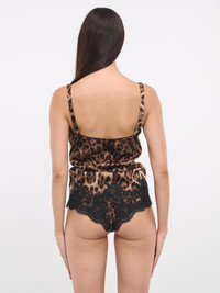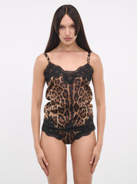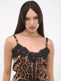 DOLCE & GABBANA brown & black tank top, tank top design, satin construction, leopard-print, lace detailing, sleeveless spaghetti straps, open back, relaxed fit. Made in Italy 80% Silk 12% Cotton 5% Spandex 3% Polyamide Numerical Sizing Model is 5'8" wearing size 1. Bust: 32" Waist: 26" Hips: 34.5"