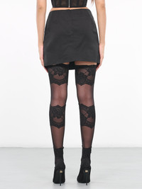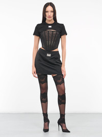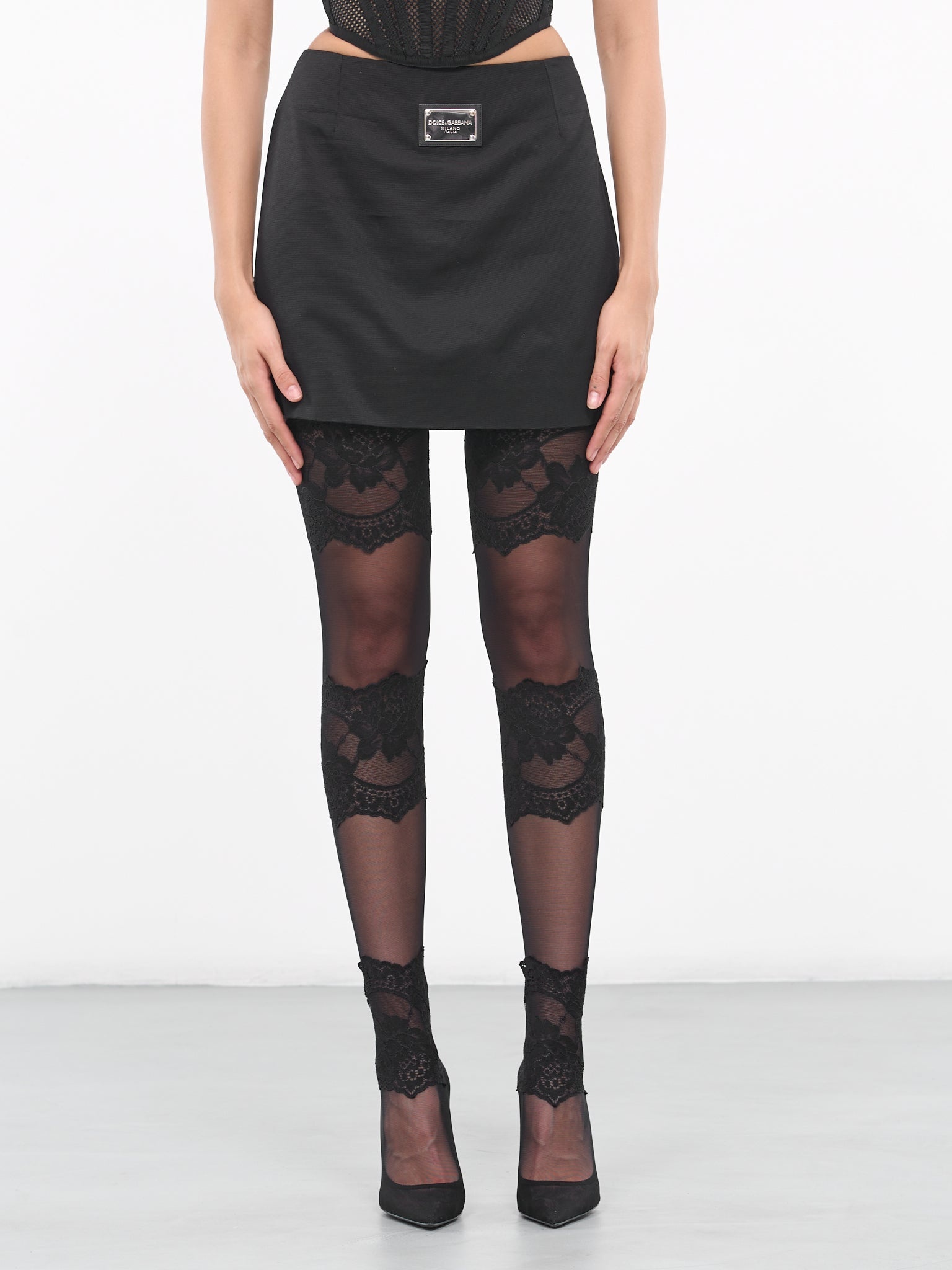 DOLCE & GABBANA black skirt, logo plaque, mid-rise, back zip & hook eye closure, mini length, slim fit. Made in Italy Body - 100% Viscose Lining - 82% Polyester, 35% Nylon, 3% Elastane Italian Sizing Model is 5'8" wearing size 40. Bust: 32" Waist: 26" Hips: 34.5"