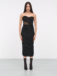 DOLCE & GABBANA dress in black, stretch tulle construction, corset-style bodice, sweetheart neckline, strapless, metal boning, underwired bust, back exposed zip closure, back hook & eye closure, silk crepe de chine underskirt, ruched & gathered design, midi length, fitted. Made in Italy Outer: 89% Polyamide 11% Spandex Inner: 70% Silk 27% Polyamide 3% Spandex Italian Sizing Model is 5'8" wearing size 42. Bust: 32" Waist: 26" Hips: 34.5"