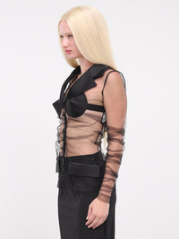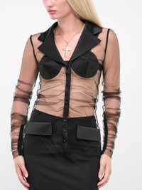 DOLCE & GABBANA top in black, paneled tulle construction, sheer, ruching throughout, notched lapel, long sleeves, front buttoned placket closure, pointed bra detailing, front faux flap pockets, slim fit. Made in Italy 80% Polyamide 17% Silk 3% Polyester Italian Sizing Model is 5'9" wearing size 40. Bust: 32" Waist: 24" Hips: 34"