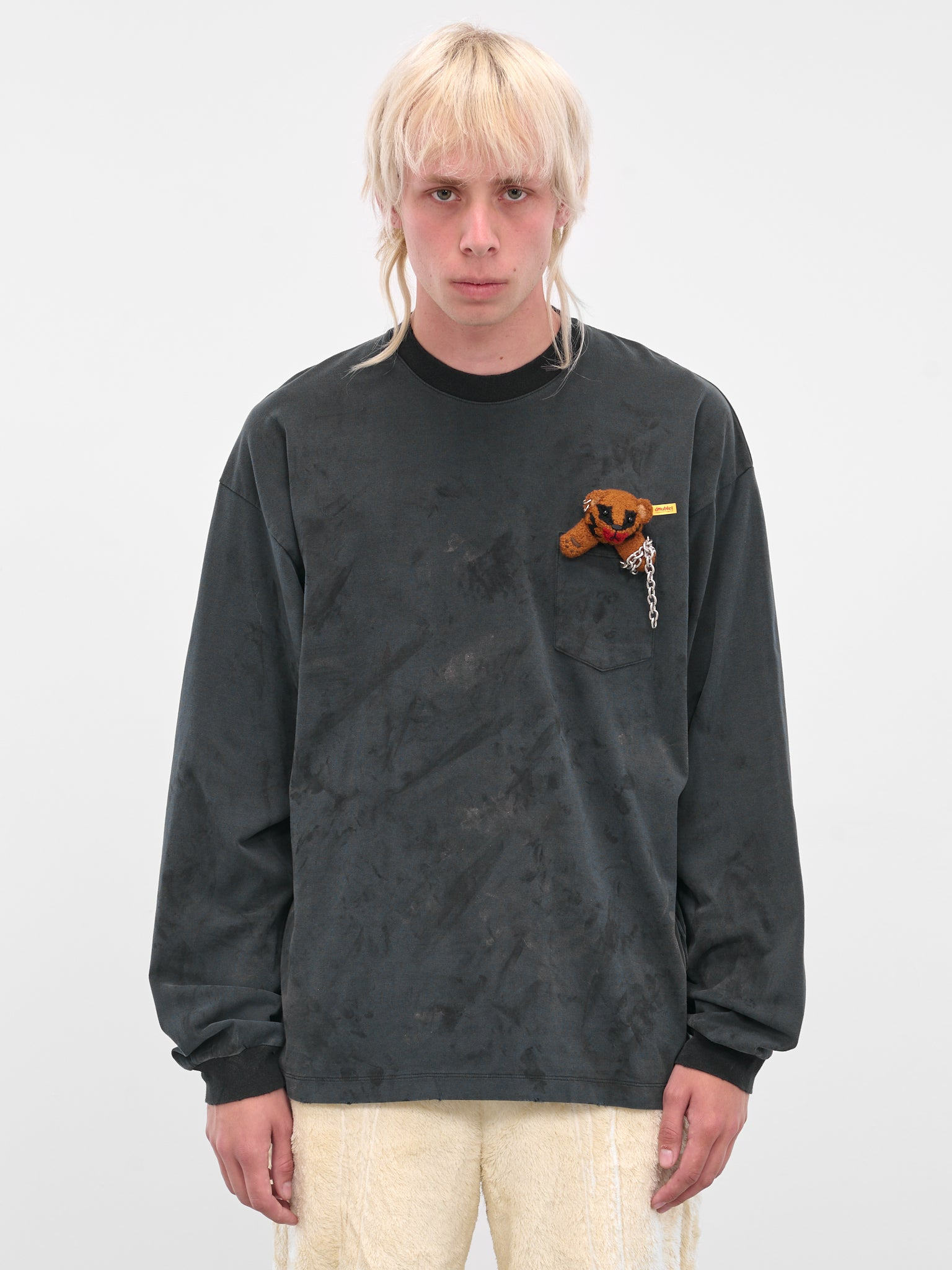 This black t-shirt is treated with a washed dye and distressed, stained finish, accented by a chest patch pocket with teddy bear and chain embellishment. Rib-knit cuffs and a relaxed silhouette complete the subversive design. Featuring: • Relaxed fit • Washed dye with distressed and stained effect • Ribbed crewneck and long sleeves • Chest patch pocket with teddy bear and chain embellishment • Rib-knit cuffs • Made in Japan • 100% Cotton • Standard sizing