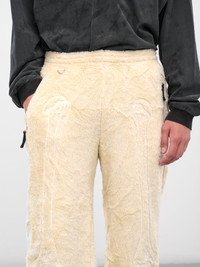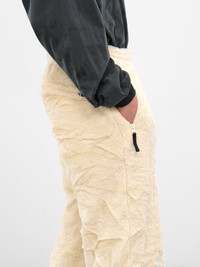Ivory fleece pants adopt a sculptural wide leg, detailed by short pile texture and skeletal bone embroidery at the front. D-ring at the waist and side/back zip pockets add functional edge. Featuring: • Wide leg and relaxed fit • Short pile fleece construction • Skeletal bone embroidery at front • Elasticated waistband with D-ring • Side and back zip pockets • Made in Japan • 100% Polyester • Standard sizing