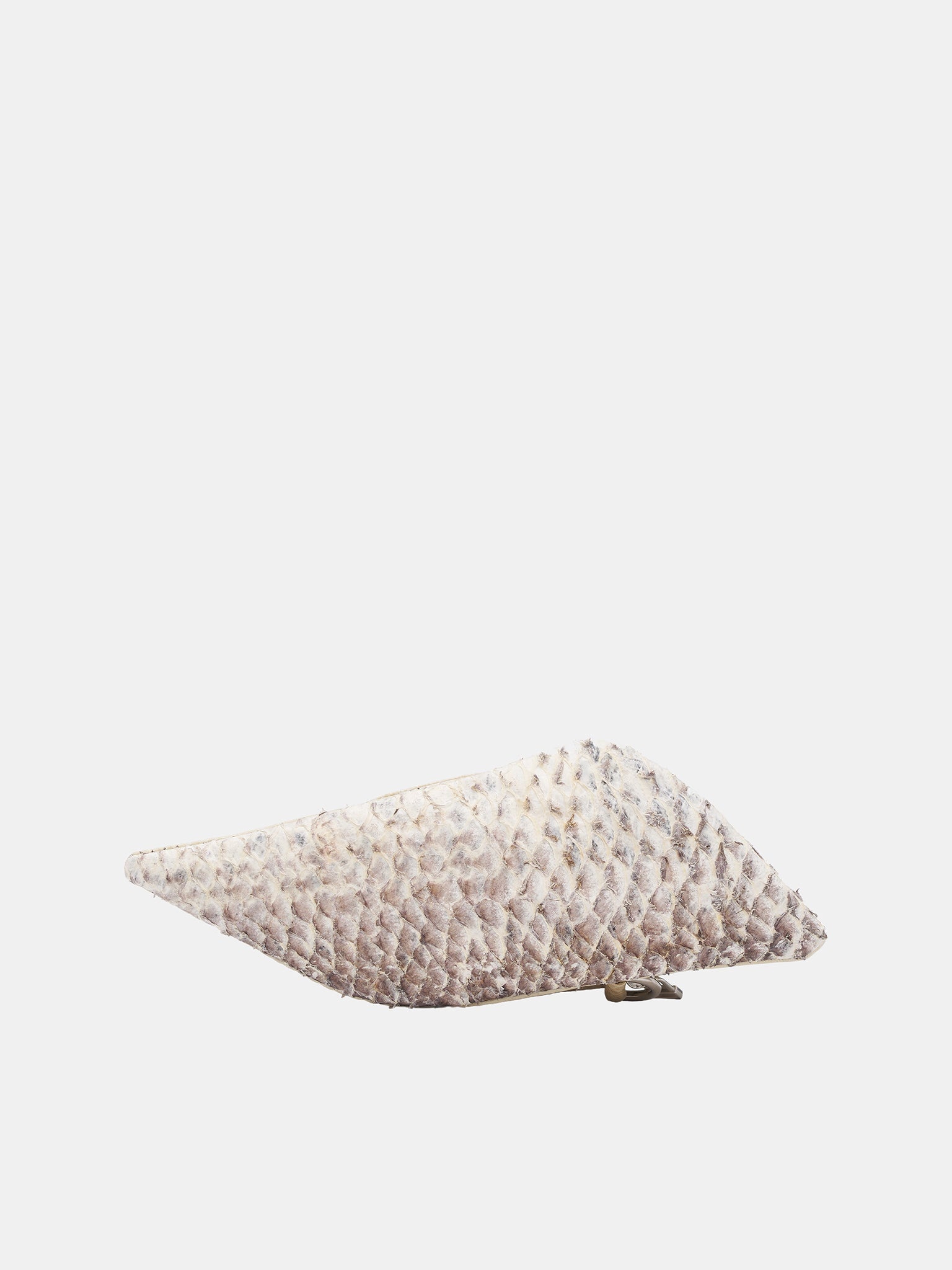 DOUBLET wallet in silver, paneled leather construction, trompe l'oeil tai scale embellishment, gold-tone embossed logo detailing, zip closure, detachable leather strap. Made in Japan Steer & Dry Fish Leather One Size