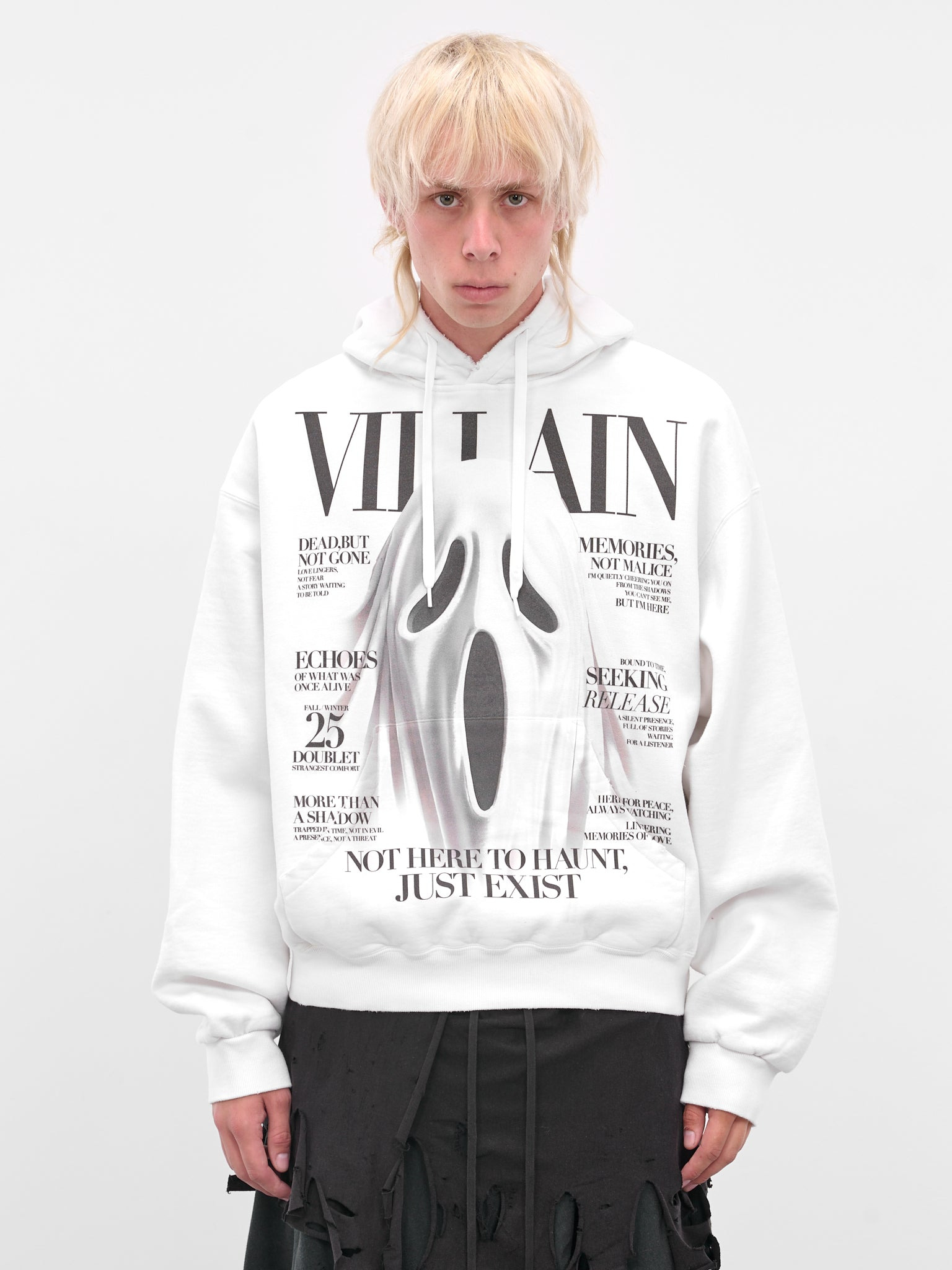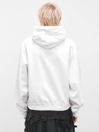 A white hoodie with a ghost graphic and lightly distressed details throughout, this piece is finished with a raw edged hood, boxy cropped fit, ribbed trims, and dropped shoulders for a sculptural, graphic look. Featuring: • Boxy fit with slight cropped length • Ghost graphic print with light distressing • Hood with adjustable drawstrings and raw edge • Dropped shoulders and long sleeves • Rib-knit cuffs and hem • Front kangaroo pocket • Made in Japan • 100% Cotton • Standard sizing