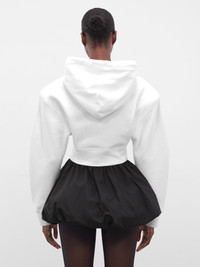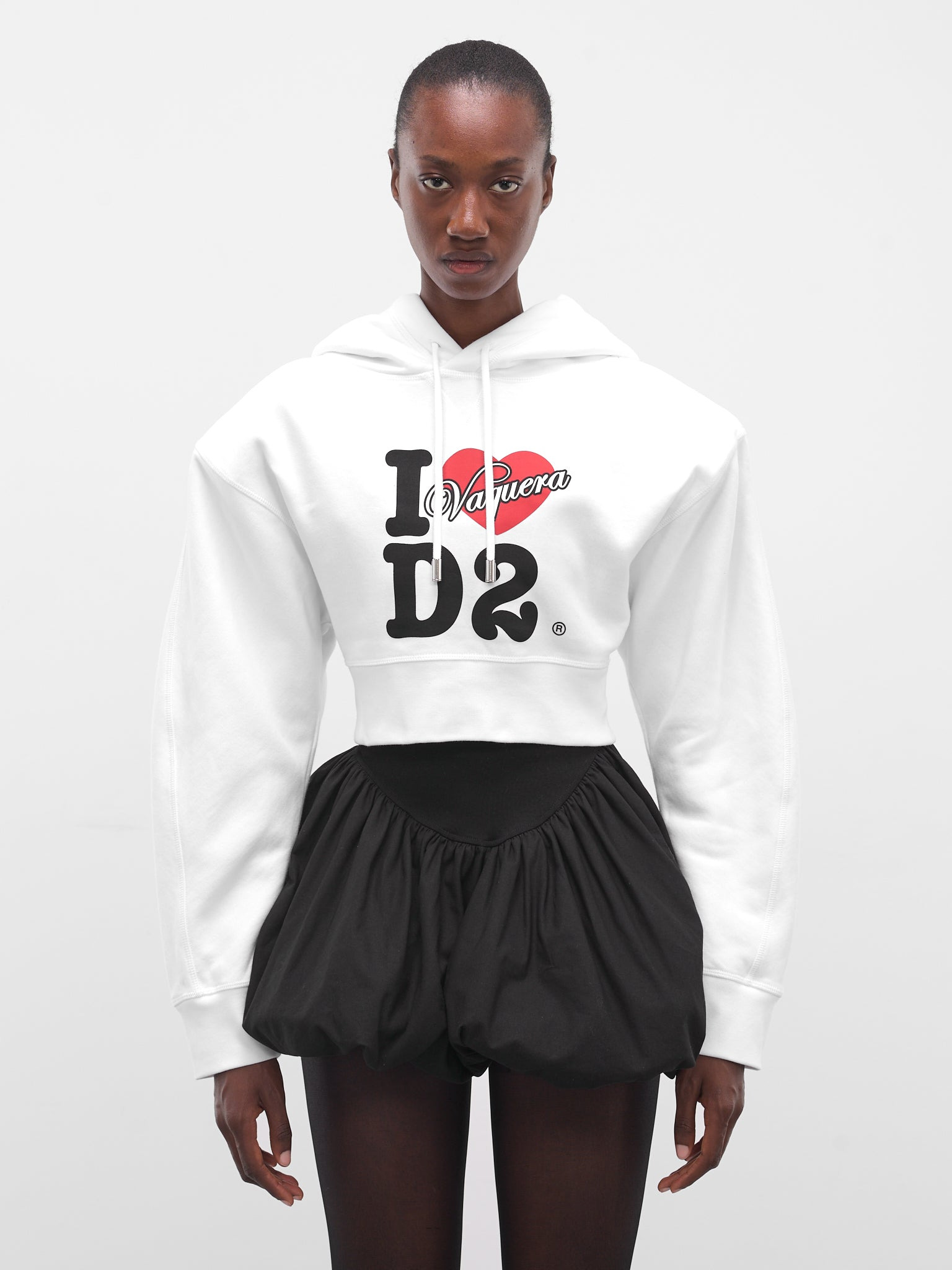 A white sweatshirt from the DSQUARED2 x Vaquera collaboration featuring a bold I Heart NY-inspired graphic print. Designed with padded shoulders and a cropped oversized silhouette. Featuring: • Oversized fit • Cotton construction • Printed I Heart NY-style collaboration graphic • Hood with adjustable drawstring • Padded shoulders • Long sleeves • Rib-knit cuffs and hem • Cropped length • Made in Italy • 100% Cotton • Standard sizing Model is 5'11" wearing size S. Bust: 31.4" Waist: 24.8" Hips: 35"