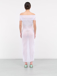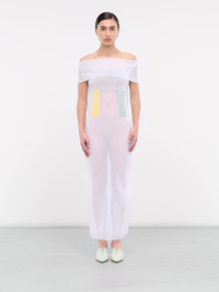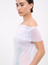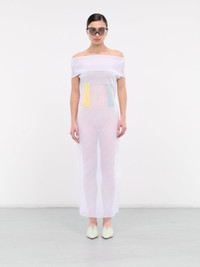 ECKHAUS LATTA dress in off-white, monofilament Italian yarn, layered knit construction, semi-sheer, color block pattern, straight neckline, off-shoulder straps, sleeveless, straight hem, maxi-length, slim fit. Made in US 100% Polyester Standard Sizing Model is 5'7" wearing size XS. Bust: 31" Waist: 24" Hips: 30"
