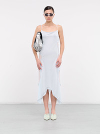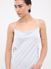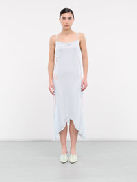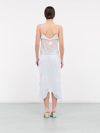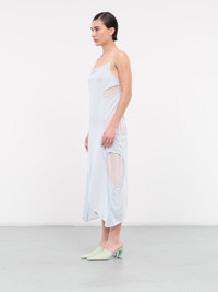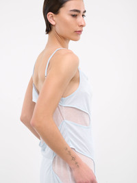 ECKHAUS LATTA dress in light blue, paneled jersey construction, cut-outs throughout, rounded neckline, spaghetti straps, sleeveless, partially open back, asymmetric hem, maxi-length, relaxed fit. Imported 85% Polyester 15% Rayon Standard Sizing Model is 5'7" wearing size S. Bust: 31" Waist: 24" Hips: 30"
