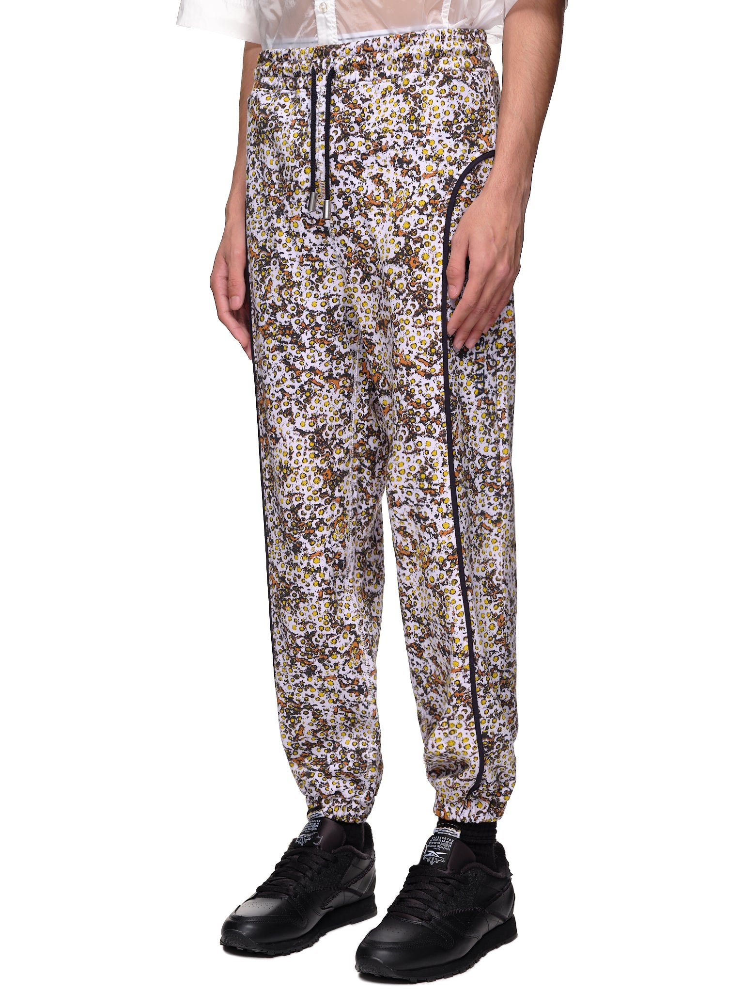 Eckhaus Latta sweatpants in multicolor, elasticized sweatpants with adjustable drawstring, inseam pockets, all over floral print, contrast piping. Made in Peru Standard Sizing. Composition: 100% Cotton Model is 6'1" and is wearing a size M Shoulders: 18" Chest: 32" Waist: 28"