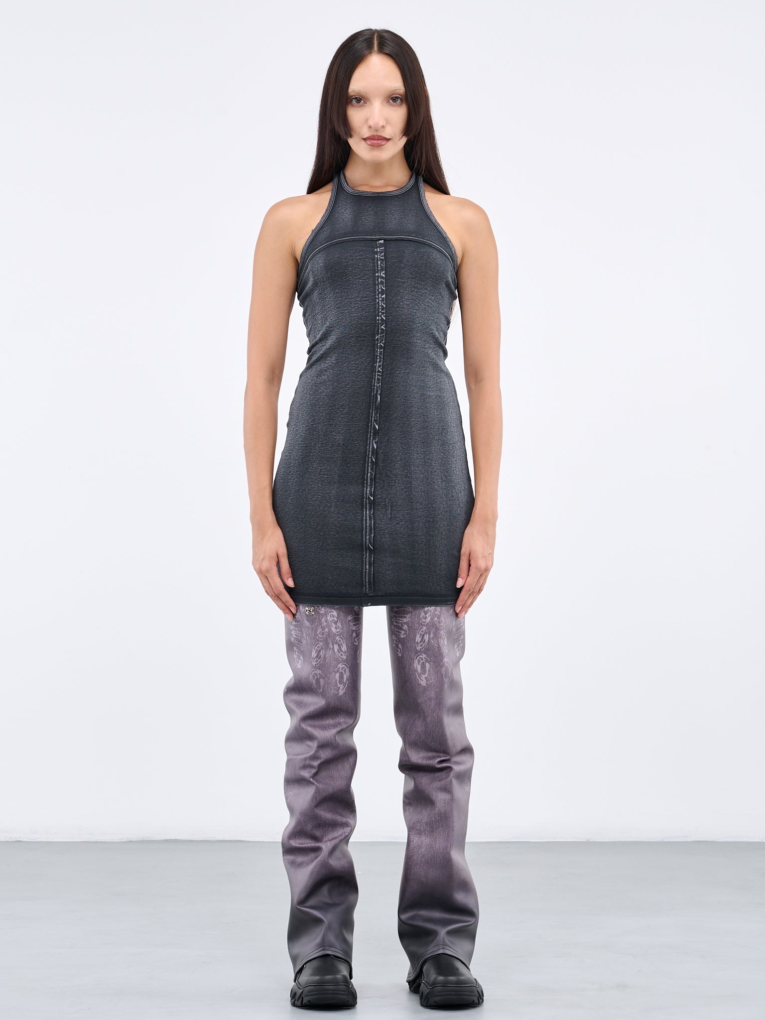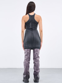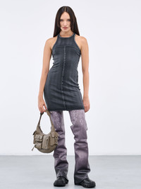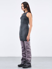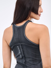 ECKHAUS LATTA dress in black, tank design, rib knit, washed treatment, seam detailing, back logo, round neck, mini length, fitted. Made in USA Standard Sizing 100% Cotton Model is 5'8" wearing size S. Bust: 32" Waist: 26" Hips: 34.5"