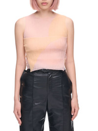 Eckhaus Latta tank top in light pink yellow, watercolor design, pleated fabric, layered construction, seam details, round neck, sleeveless, semi-fitted. Made in Italy Standard Sizing Composition: 70% Polyamide, 30% Polyester Model is 5'9" and is wearing size S. Bust: 32" Waist: 25" Hip: 35"