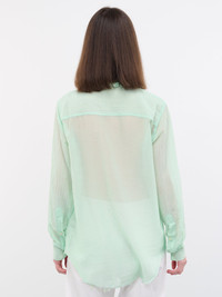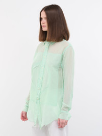 EDWARD CUMING shirt in green, paneled design, lightweight recycled rayon, center circle detail, semi-sheer, pointed collar, mother of pearl button closure & cuffs, long sleeves, frayed edges, curved hem, regular fit. Made in Spain US Sizing 100% Rayon Model is 5'10" wearing size 1. Bust: 32" Waist: 24" Hips: 35"