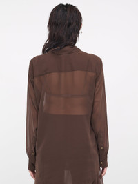 EDWARD CUMING brown shirt, draped design, semi-sheer, pointed collar, button closure & cuffs, long sleeves, shirttail hem, relaxed fit. Numeric Sizing Model is 5'10" wearing size 1. Bust: 31" Waist: 23.5" Hips: 35"