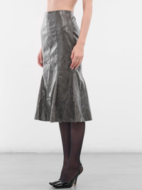 Brown vegan leather midi skirt with peplum hem and raw edges, cut slim with concealed zip closure. Featuring: • Slim fit • Vegan leather construction • High-waisted design • Back concealed zip closure • Raw hem finish • Peplum hem • Midi length • US sizing Model is 5'9" wearing size 2. Bust: 32" Waist: 25" Hips: 34"