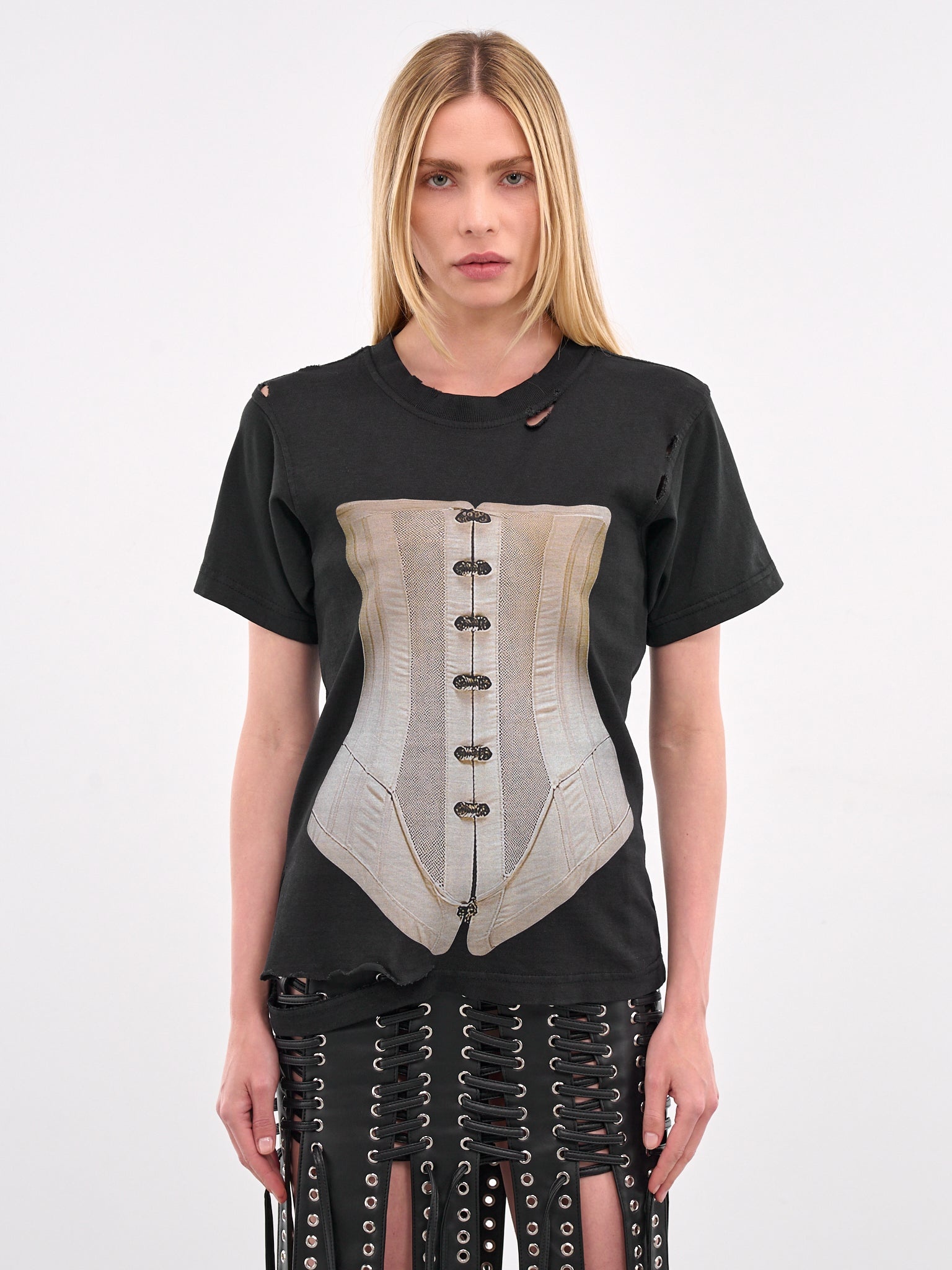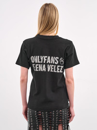 ELENA VELEZ x ONLYFANS t-shirt in black, paneled construction, trompe l'oeil corset graphic print, distressing, ribbed crewneck, short sleeves, straight hem, relaxed fit. Standard Sizing Model is 5'8" wearing size S. Bust: 32" Waist: 24" Hips: 35"