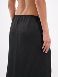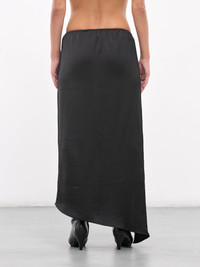 ELENA VELEZ skirt in black, paneled satin construction, mid-waisted, elasticated waistband, leg oval slit, asymmetric hem, midi-length, slim fit. Made in US 96% Polyester 4% Spandex Standard Sizing Model is 5'6" wearing size S. Bust: 31" Waist: 24" Hips: 34"