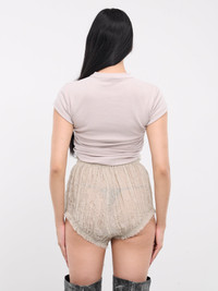 ELENA VELEZ t-shirt in beige, paneled jersey construction, ruching throughout, crewneck, short sleeves, chest metal logo detailing, straight hem, cropped length, slim fit. Made in NYC Standard Sizing Model is 5'8" wearing size S. Bust: 32" Waist: 26" Hips: 34.5"