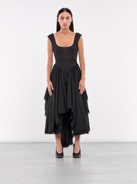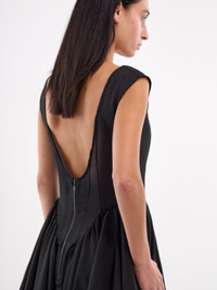 ELENA VELEZ black dress, open weave construction, scoop neck, open back, sleeveless, shoulder straps, back exposed zip closure, ruffled hem, high-low hemline, midi-length, fitted. Made in NYC US Sizing Model is 5'10" wearing size 2. Bust: 32" Waist: 24" Hips: 33"
