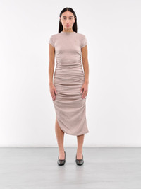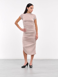 ELENA VELEZ dress in beige, t-shirt dress design, paneled lyocell-wool blend construction, crewneck, short sleeves, waist ruching & gathering, side slit, asymmetric hem, midi-length, slim fit. Made in US Lyocell Wool Blend Standard Sizing Model is 5'6" wearing size S. Bust: 31" Waist: 24" Hips: 34"