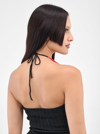 ELL/SS top in red navy, two-tone asymmetric design, rib knit, organic cotton, deep plunging neckline, halter tie, open back, slight crop, fitted. Made in Slovenia Standard Sizing 100% Organic Cotton Model is 5'8" wearing size S. Bust: 32" Waist: 26" Hips: 34.5"