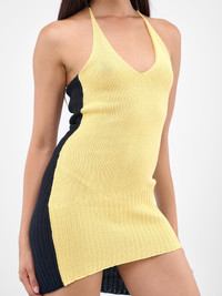 ELL/SS dress in yellow navy, two-tone asymmetric design, rib knit, organic cotton, deep plunging neckline, halter tie, open back, mini length, fitted. Made in Slovenia Standard Sizing 100% Organic Cotton Model is 5'8" wearing size S. Bust: 32" Waist: 26" Hips: 34.5"