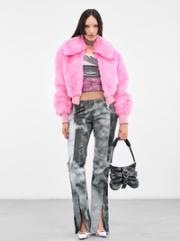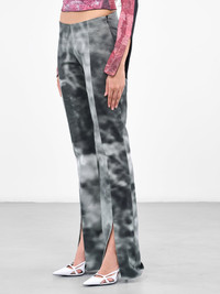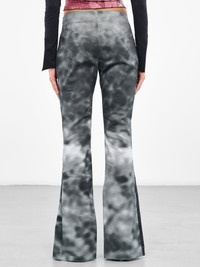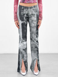 ELL/SS pants in black, flared silhouette, printed imagery, organic cotton, low-rise, side seam zip closure, split hem, slim fit. Made in Slovenia Standard Sizing 100% Organic Cotton Model is 5'8" wearing size S. Bust: 32" Waist: 26" Hips: 34.5"