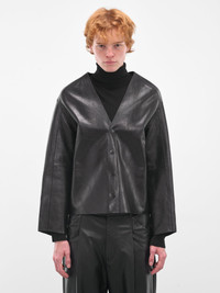 A black leather jacket with a V-neckline and boxy proportions, refined through a front button closure. Its oversized structure emphasizes a sharp silhouette. Featuring: • Oversized boxy fit • V-neckline • Front button closure • Dropped shoulders and long sleeves • 100% Cowhide leather • Standard sizing Model is 6'3" wearing size M. Shoulders: 18" Chest: 36" Waist: 28.5"